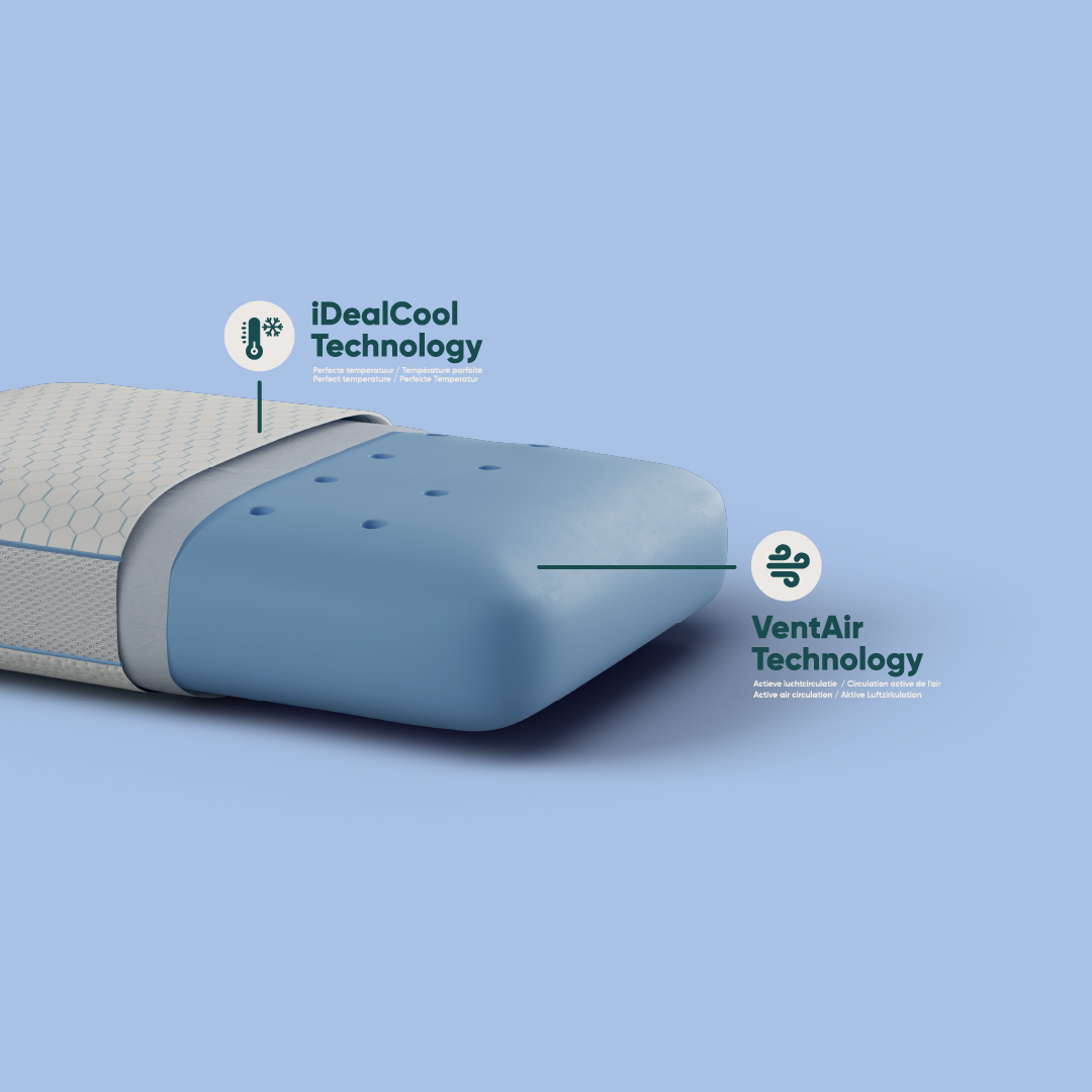 Im Kissenkern steckt mehr als nur Visco. Die VentAir-Technologie sorgt für aktive Luftzirkulation. Offene Zellstruktur, gezielte Perforationen und ein 3D-Belüftungsband leiten Wärme und Feuchtigkeit zuverlässig ab – die ganze Nacht über.